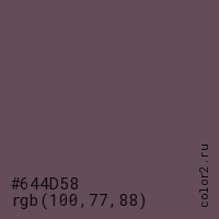 Цвет #644D58 в цветовой модели RGB обозначается тремя октетами (100, 77, 88) в десятичном формате и #644D58 в шестнадцатиричном (hex) формате, которые являются интенсивностью красного 100 (hex 64), интенсивность зелёного 77 (hex 4D) и интенсивность синего 88 (hex 58).