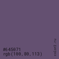 Цвет #645071 в цветовой модели RGB обозначается тремя октетами (100, 80, 113) в десятичном формате и #645071 в шестнадцатиричном (hex) формате, которые являются интенсивностью красного 100 (hex 64), интенсивность зелёного 80 (hex 50) и интенсивность синего 113 (hex 71).