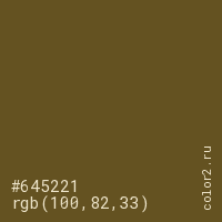Цвет #645221 в цветовой модели RGB обозначается тремя октетами (100, 82, 33) в десятичном формате и #645221 в шестнадцатиричном (hex) формате, которые являются интенсивностью красного 100 (hex 64), интенсивность зелёного 82 (hex 52) и интенсивность синего 33 (hex 21).