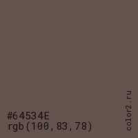 Цвет #64534E в цветовой модели RGB обозначается тремя октетами (100, 83, 78) в десятичном формате и #64534E в шестнадцатиричном (hex) формате, которые являются интенсивностью красного 100 (hex 64), интенсивность зелёного 83 (hex 53) и интенсивность синего 78 (hex 4E).