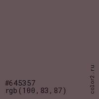 Цвет #645357 в цветовой модели RGB обозначается тремя октетами (100, 83, 87) в десятичном формате и #645357 в шестнадцатиричном (hex) формате, которые являются интенсивностью красного 100 (hex 64), интенсивность зелёного 83 (hex 53) и интенсивность синего 87 (hex 57).
