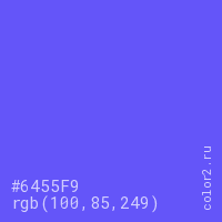 Цвет #6455F9 в цветовой модели RGB обозначается тремя октетами (100, 85, 249) в десятичном формате и #6455F9 в шестнадцатиричном (hex) формате, которые являются интенсивностью красного 100 (hex 64), интенсивность зелёного 85 (hex 55) и интенсивность синего 249 (hex F9).
