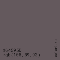 Цвет #64595D в цветовой модели RGB обозначается тремя октетами (100, 89, 93) в десятичном формате и #64595D в шестнадцатиричном (hex) формате, которые являются интенсивностью красного 100 (hex 64), интенсивность зелёного 89 (hex 59) и интенсивность синего 93 (hex 5D).