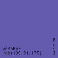 Цвет #645BAF в цветовой модели RGB обозначается тремя октетами (100, 91, 175) в десятичном формате и #645BAF в шестнадцатиричном (hex) формате, которые являются интенсивностью красного 100 (hex 64), интенсивность зелёного 91 (hex 5B) и интенсивность синего 175 (hex AF).