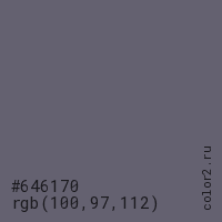 Цвет #646170 в цветовой модели RGB обозначается тремя октетами (100, 97, 112) в десятичном формате и #646170 в шестнадцатиричном (hex) формате, которые являются интенсивностью красного 100 (hex 64), интенсивность зелёного 97 (hex 61) и интенсивность синего 112 (hex 70).