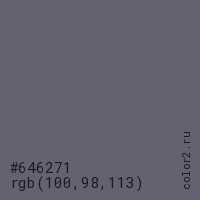 Цвет #646271 в цветовой модели RGB обозначается тремя октетами (100, 98, 113) в десятичном формате и #646271 в шестнадцатиричном (hex) формате, которые являются интенсивностью красного 100 (hex 64), интенсивность зелёного 98 (hex 62) и интенсивность синего 113 (hex 71).