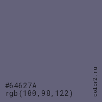 Цвет #64627A в цветовой модели RGB обозначается тремя октетами (100, 98, 122) в десятичном формате и #64627A в шестнадцатиричном (hex) формате, которые являются интенсивностью красного 100 (hex 64), интенсивность зелёного 98 (hex 62) и интенсивность синего 122 (hex 7A).