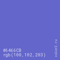Цвет #6466CB в цветовой модели RGB обозначается тремя октетами (100, 102, 203) в десятичном формате и #6466CB в шестнадцатиричном (hex) формате, которые являются интенсивностью красного 100 (hex 64), интенсивность зелёного 102 (hex 66) и интенсивность синего 203 (hex CB).