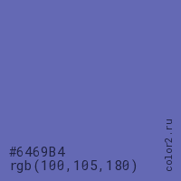 Цвет #6469B4 в цветовой модели RGB обозначается тремя октетами (100, 105, 180) в десятичном формате и #6469B4 в шестнадцатиричном (hex) формате, которые являются интенсивностью красного 100 (hex 64), интенсивность зелёного 105 (hex 69) и интенсивность синего 180 (hex B4).