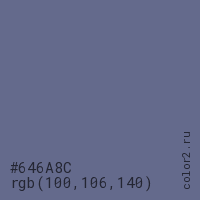 Цвет #646A8C в цветовой модели RGB обозначается тремя октетами (100, 106, 140) в десятичном формате и #646A8C в шестнадцатиричном (hex) формате, которые являются интенсивностью красного 100 (hex 64), интенсивность зелёного 106 (hex 6A) и интенсивность синего 140 (hex 8C).