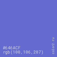 Цвет #646ACF в цветовой модели RGB обозначается тремя октетами (100, 106, 207) в десятичном формате и #646ACF в шестнадцатиричном (hex) формате, которые являются интенсивностью красного 100 (hex 64), интенсивность зелёного 106 (hex 6A) и интенсивность синего 207 (hex CF).