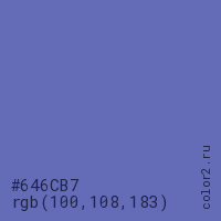 Цвет #646CB7 в цветовой модели RGB обозначается тремя октетами (100, 108, 183) в десятичном формате и #646CB7 в шестнадцатиричном (hex) формате, которые являются интенсивностью красного 100 (hex 64), интенсивность зелёного 108 (hex 6C) и интенсивность синего 183 (hex B7).