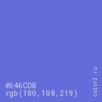 Цвет #646CDB в цветовой модели RGB обозначается тремя октетами (100, 108, 219) в десятичном формате и #646CDB в шестнадцатиричном (hex) формате, которые являются интенсивностью красного 100 (hex 64), интенсивность зелёного 108 (hex 6C) и интенсивность синего 219 (hex DB).
