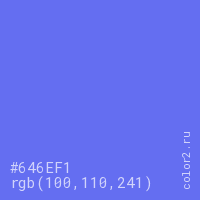 Цвет #646EF1 в цветовой модели RGB обозначается тремя октетами (100, 110, 241) в десятичном формате и #646EF1 в шестнадцатиричном (hex) формате, которые являются интенсивностью красного 100 (hex 64), интенсивность зелёного 110 (hex 6E) и интенсивность синего 241 (hex F1).