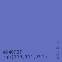 Цвет #646FBF в цветовой модели RGB обозначается тремя октетами (100, 111, 191) в десятичном формате и #646FBF в шестнадцатиричном (hex) формате, которые являются интенсивностью красного 100 (hex 64), интенсивность зелёного 111 (hex 6F) и интенсивность синего 191 (hex BF).