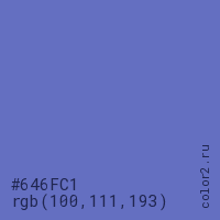 Цвет #646FC1 в цветовой модели RGB обозначается тремя октетами (100, 111, 193) в десятичном формате и #646FC1 в шестнадцатиричном (hex) формате, которые являются интенсивностью красного 100 (hex 64), интенсивность зелёного 111 (hex 6F) и интенсивность синего 193 (hex C1).