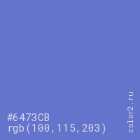 Цвет #6473CB в цветовой модели RGB обозначается тремя октетами (100, 115, 203) в десятичном формате и #6473CB в шестнадцатиричном (hex) формате, которые являются интенсивностью красного 100 (hex 64), интенсивность зелёного 115 (hex 73) и интенсивность синего 203 (hex CB).