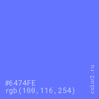 Цвет #6474FE в цветовой модели RGB обозначается тремя октетами (100, 116, 254) в десятичном формате и #6474FE в шестнадцатиричном (hex) формате, которые являются интенсивностью красного 100 (hex 64), интенсивность зелёного 116 (hex 74) и интенсивность синего 254 (hex FE).