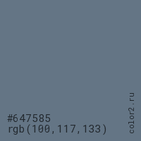 Цвет #647585 в цветовой модели RGB обозначается тремя октетами (100, 117, 133) в десятичном формате и #647585 в шестнадцатиричном (hex) формате, которые являются интенсивностью красного 100 (hex 64), интенсивность зелёного 117 (hex 75) и интенсивность синего 133 (hex 85).