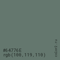 Цвет #64776E в цветовой модели RGB обозначается тремя октетами (100, 119, 110) в десятичном формате и #64776E в шестнадцатиричном (hex) формате, которые являются интенсивностью красного 100 (hex 64), интенсивность зелёного 119 (hex 77) и интенсивность синего 110 (hex 6E).