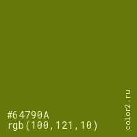 Цвет #64790A в цветовой модели RGB обозначается тремя октетами (100, 121, 10) в десятичном формате и #64790A в шестнадцатиричном (hex) формате, которые являются интенсивностью красного 100 (hex 64), интенсивность зелёного 121 (hex 79) и интенсивность синего 10 (hex 0A).
