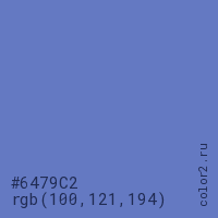 Цвет #6479C2 в цветовой модели RGB обозначается тремя октетами (100, 121, 194) в десятичном формате и #6479C2 в шестнадцатиричном (hex) формате, которые являются интенсивностью красного 100 (hex 64), интенсивность зелёного 121 (hex 79) и интенсивность синего 194 (hex C2).
