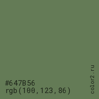 Цвет #647B56 в цветовой модели RGB обозначается тремя октетами (100, 123, 86) в десятичном формате и #647B56 в шестнадцатиричном (hex) формате, которые являются интенсивностью красного 100 (hex 64), интенсивность зелёного 123 (hex 7B) и интенсивность синего 86 (hex 56).
