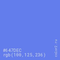 Цвет #647DEC в цветовой модели RGB обозначается тремя октетами (100, 125, 236) в десятичном формате и #647DEC в шестнадцатиричном (hex) формате, которые являются интенсивностью красного 100 (hex 64), интенсивность зелёного 125 (hex 7D) и интенсивность синего 236 (hex EC).