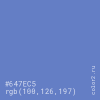 Цвет #647EC5 в цветовой модели RGB обозначается тремя октетами (100, 126, 197) в десятичном формате и #647EC5 в шестнадцатиричном (hex) формате, которые являются интенсивностью красного 100 (hex 64), интенсивность зелёного 126 (hex 7E) и интенсивность синего 197 (hex C5).