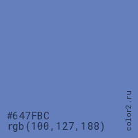 Цвет #647FBC в цветовой модели RGB обозначается тремя октетами (100, 127, 188) в десятичном формате и #647FBC в шестнадцатиричном (hex) формате, которые являются интенсивностью красного 100 (hex 64), интенсивность зелёного 127 (hex 7F) и интенсивность синего 188 (hex BC).