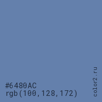 Цвет #6480AC в цветовой модели RGB обозначается тремя октетами (100, 128, 172) в десятичном формате и #6480AC в шестнадцатиричном (hex) формате, которые являются интенсивностью красного 100 (hex 64), интенсивность зелёного 128 (hex 80) и интенсивность синего 172 (hex AC).