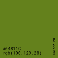 Цвет #64811C в цветовой модели RGB обозначается тремя октетами (100, 129, 28) в десятичном формате и #64811C в шестнадцатиричном (hex) формате, которые являются интенсивностью красного 100 (hex 64), интенсивность зелёного 129 (hex 81) и интенсивность синего 28 (hex 1C).
