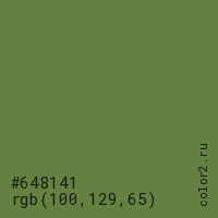 Цвет #648141 в цветовой модели RGB обозначается тремя октетами (100, 129, 65) в десятичном формате и #648141 в шестнадцатиричном (hex) формате, которые являются интенсивностью красного 100 (hex 64), интенсивность зелёного 129 (hex 81) и интенсивность синего 65 (hex 41).