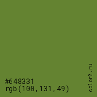Цвет #648331 в цветовой модели RGB обозначается тремя октетами (100, 131, 49) в десятичном формате и #648331 в шестнадцатиричном (hex) формате, которые являются интенсивностью красного 100 (hex 64), интенсивность зелёного 131 (hex 83) и интенсивность синего 49 (hex 31).