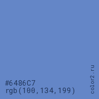 Цвет #6486C7 в цветовой модели RGB обозначается тремя октетами (100, 134, 199) в десятичном формате и #6486C7 в шестнадцатиричном (hex) формате, которые являются интенсивностью красного 100 (hex 64), интенсивность зелёного 134 (hex 86) и интенсивность синего 199 (hex C7).