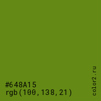 Цвет #648A15 в цветовой модели RGB обозначается тремя октетами (100, 138, 21) в десятичном формате и #648A15 в шестнадцатиричном (hex) формате, которые являются интенсивностью красного 100 (hex 64), интенсивность зелёного 138 (hex 8A) и интенсивность синего 21 (hex 15).