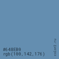 Цвет #648EB0 в цветовой модели RGB обозначается тремя октетами (100, 142, 176) в десятичном формате и #648EB0 в шестнадцатиричном (hex) формате, которые являются интенсивностью красного 100 (hex 64), интенсивность зелёного 142 (hex 8E) и интенсивность синего 176 (hex B0).