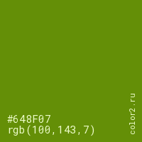 Цвет #648F07 в цветовой модели RGB обозначается тремя октетами (100, 143, 7) в десятичном формате и #648F07 в шестнадцатиричном (hex) формате, которые являются интенсивностью красного 100 (hex 64), интенсивность зелёного 143 (hex 8F) и интенсивность синего 7 (hex 07).