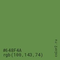 Цвет #648F4A в цветовой модели RGB обозначается тремя октетами (100, 143, 74) в десятичном формате и #648F4A в шестнадцатиричном (hex) формате, которые являются интенсивностью красного 100 (hex 64), интенсивность зелёного 143 (hex 8F) и интенсивность синего 74 (hex 4A).