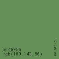 Цвет #648F56 в цветовой модели RGB обозначается тремя октетами (100, 143, 86) в десятичном формате и #648F56 в шестнадцатиричном (hex) формате, которые являются интенсивностью красного 100 (hex 64), интенсивность зелёного 143 (hex 8F) и интенсивность синего 86 (hex 56).