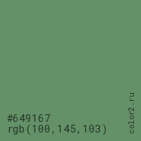 Цвет #649167 в цветовой модели RGB обозначается тремя октетами (100, 145, 103) в десятичном формате и #649167 в шестнадцатиричном (hex) формате, которые являются интенсивностью красного 100 (hex 64), интенсивность зелёного 145 (hex 91) и интенсивность синего 103 (hex 67).