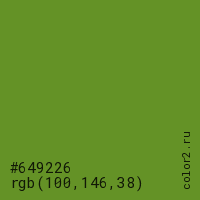 Цвет #649226 в цветовой модели RGB обозначается тремя октетами (100, 146, 38) в десятичном формате и #649226 в шестнадцатиричном (hex) формате, которые являются интенсивностью красного 100 (hex 64), интенсивность зелёного 146 (hex 92) и интенсивность синего 38 (hex 26).