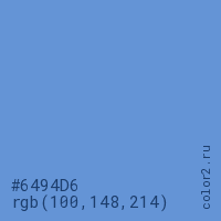 Цвет #6494D6 в цветовой модели RGB обозначается тремя октетами (100, 148, 214) в десятичном формате и #6494D6 в шестнадцатиричном (hex) формате, которые являются интенсивностью красного 100 (hex 64), интенсивность зелёного 148 (hex 94) и интенсивность синего 214 (hex D6).