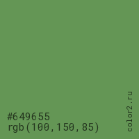 Цвет #649655 в цветовой модели RGB обозначается тремя октетами (100, 150, 85) в десятичном формате и #649655 в шестнадцатиричном (hex) формате, которые являются интенсивностью красного 100 (hex 64), интенсивность зелёного 150 (hex 96) и интенсивность синего 85 (hex 55).