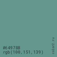 Цвет #64978B в цветовой модели RGB обозначается тремя октетами (100, 151, 139) в десятичном формате и #64978B в шестнадцатиричном (hex) формате, которые являются интенсивностью красного 100 (hex 64), интенсивность зелёного 151 (hex 97) и интенсивность синего 139 (hex 8B).