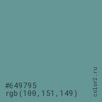 Цвет #649795 в цветовой модели RGB обозначается тремя октетами (100, 151, 149) в десятичном формате и #649795 в шестнадцатиричном (hex) формате, которые являются интенсивностью красного 100 (hex 64), интенсивность зелёного 151 (hex 97) и интенсивность синего 149 (hex 95).