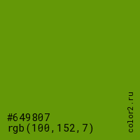 Цвет #649807 в цветовой модели RGB обозначается тремя октетами (100, 152, 7) в десятичном формате и #649807 в шестнадцатиричном (hex) формате, которые являются интенсивностью красного 100 (hex 64), интенсивность зелёного 152 (hex 98) и интенсивность синего 7 (hex 07).