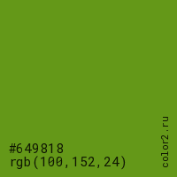 Цвет #649818 в цветовой модели RGB обозначается тремя октетами (100, 152, 24) в десятичном формате и #649818 в шестнадцатиричном (hex) формате, которые являются интенсивностью красного 100 (hex 64), интенсивность зелёного 152 (hex 98) и интенсивность синего 24 (hex 18).