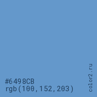 Цвет #6498CB в цветовой модели RGB обозначается тремя октетами (100, 152, 203) в десятичном формате и #6498CB в шестнадцатиричном (hex) формате, которые являются интенсивностью красного 100 (hex 64), интенсивность зелёного 152 (hex 98) и интенсивность синего 203 (hex CB).
