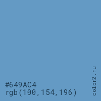 Цвет #649AC4 в цветовой модели RGB обозначается тремя октетами (100, 154, 196) в десятичном формате и #649AC4 в шестнадцатиричном (hex) формате, которые являются интенсивностью красного 100 (hex 64), интенсивность зелёного 154 (hex 9A) и интенсивность синего 196 (hex C4).